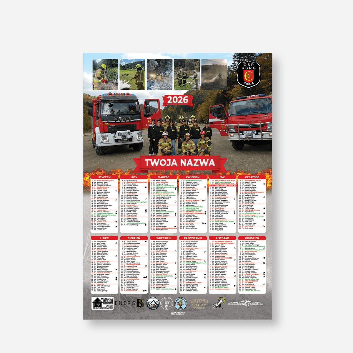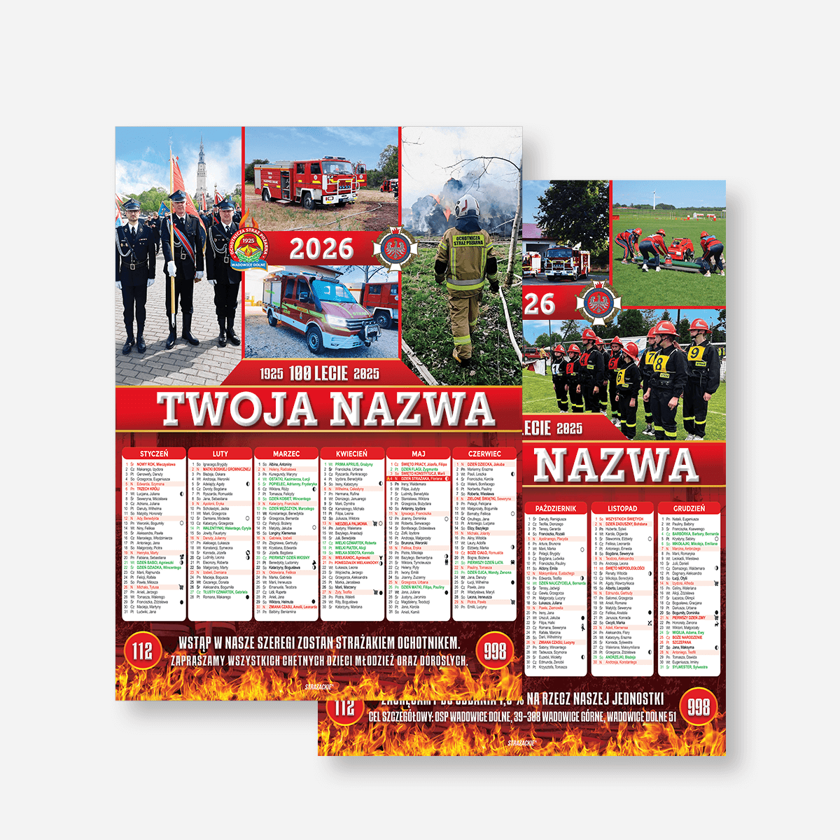 Szukasz profesjonalnie wykonanych kalendarzy strażackich? W strazackie.pl oferujemy kompleksową obsługę – od projektu, przez druk, aż po wysyłkę. Nasz doświadczony zespół grafików tworzy unikalne, indywidualne wzory na podstawie przesłanych zdjęć, dzięki czemu każdy kalendarz OSP jest wyjątkowy i dopasowany do potrzeb jednostki.