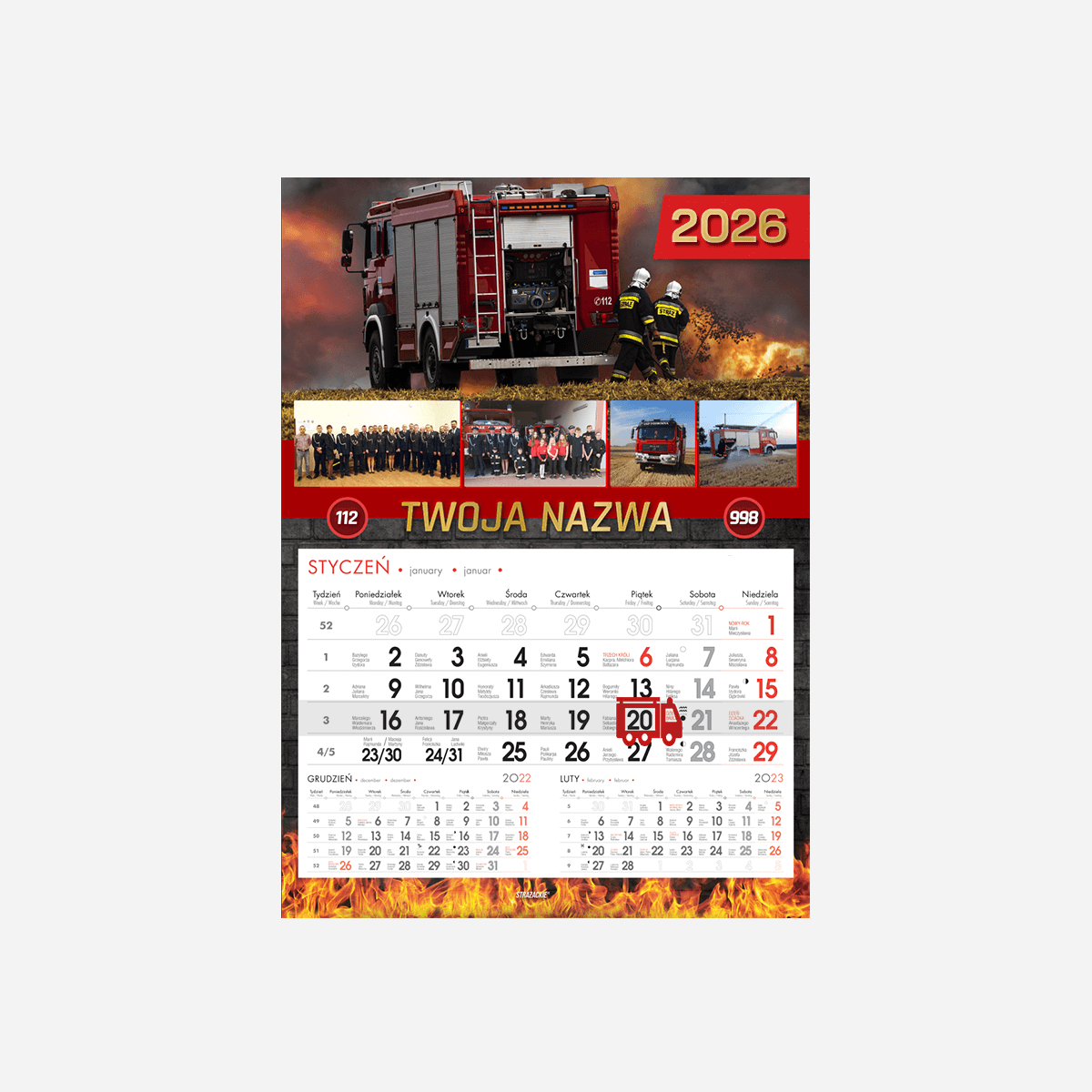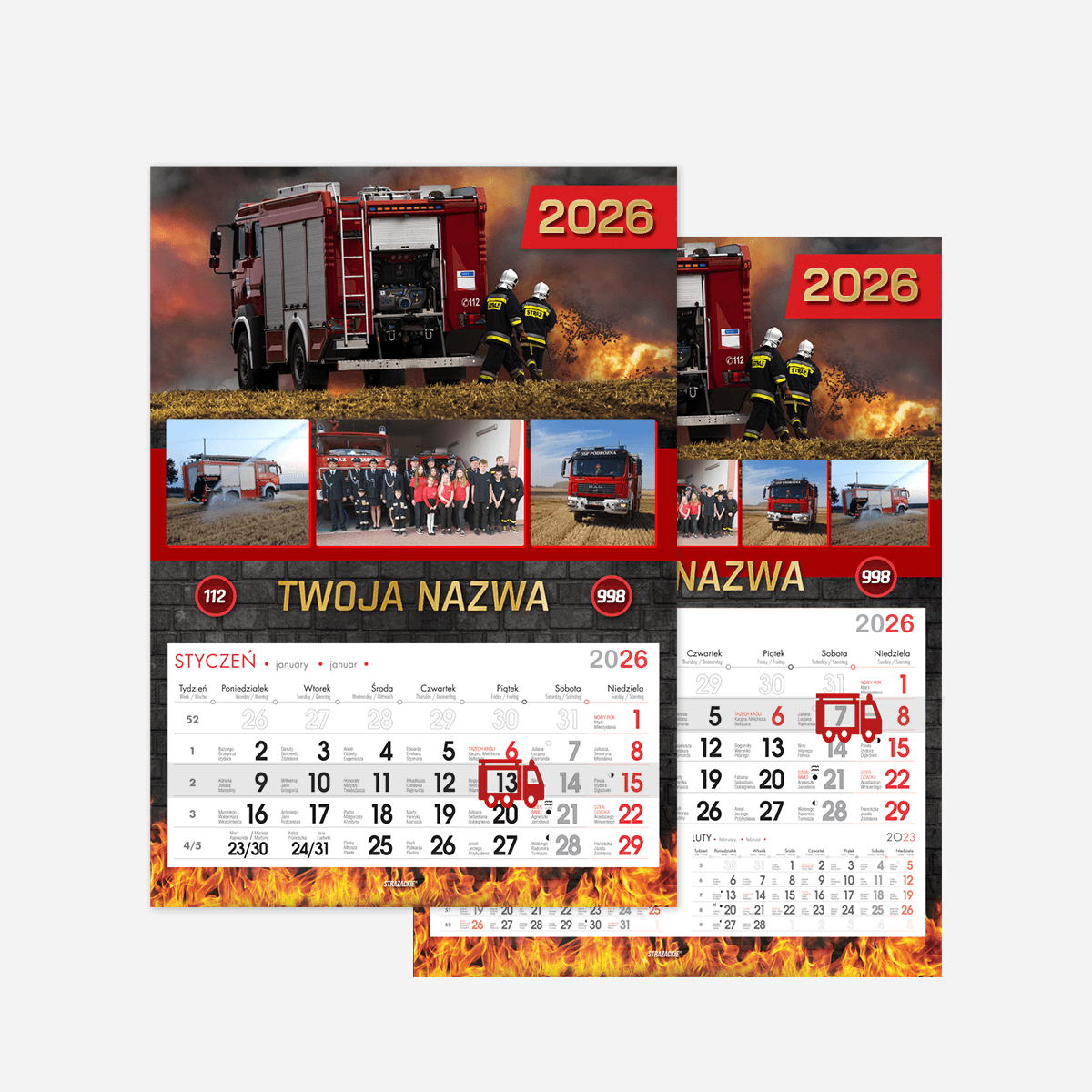kalendarze strażackie DWUDZIELNE XL z okienkami wóz i miejscem na sponsorów