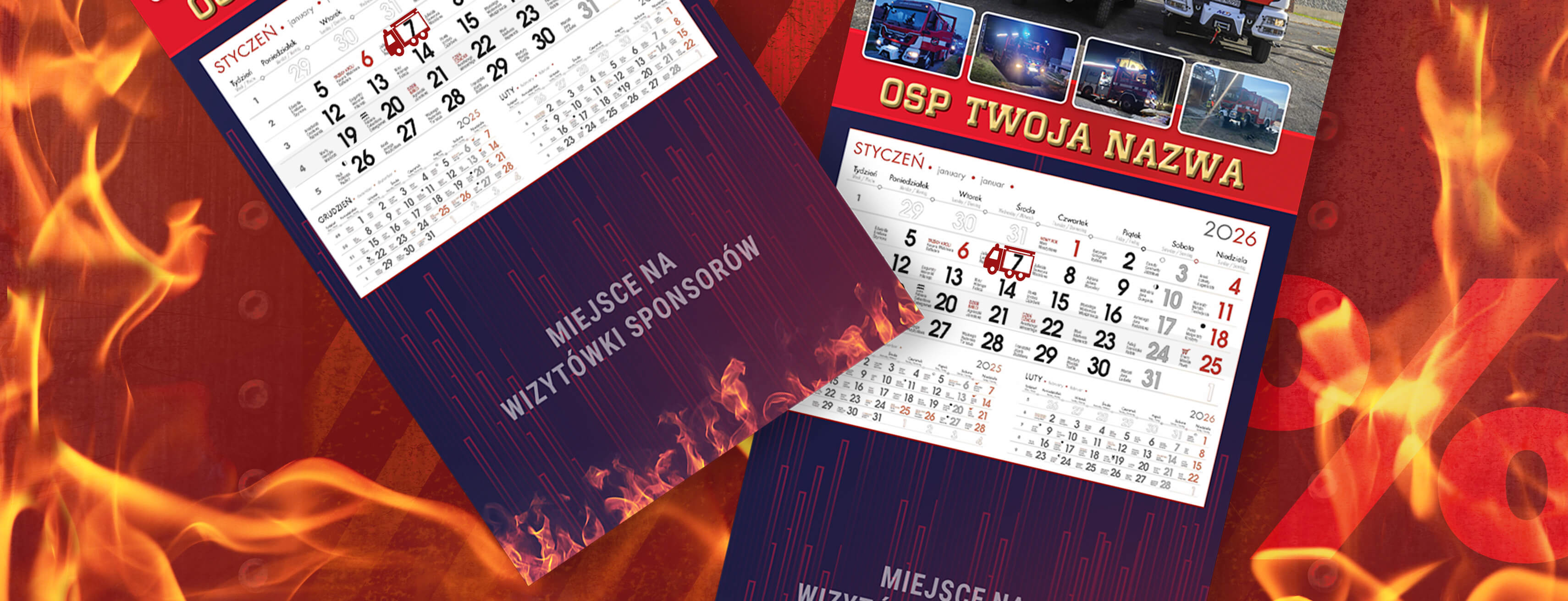 W naszej ofercie znajdziesz m.in. kalendarze strażackie jednodzielne zwane przez nas jako kalendarze strażackie wyrywane, wykonujemy także kalendarze strażackie trójdzielne oraz chętnie wybierane kalendarze strażackie spiralowane 7-stronnicowe – wszystkie kalendarze strażackie z miejscem na sponsorów. Dzięki temu każdy znajdzie coś odpowiedniego dla swojej jednostki.