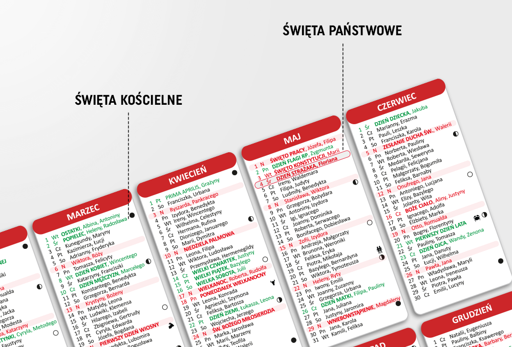 - Kalendarium: świeckie, kościelne, święta państwowe, święta okolicznościowe,