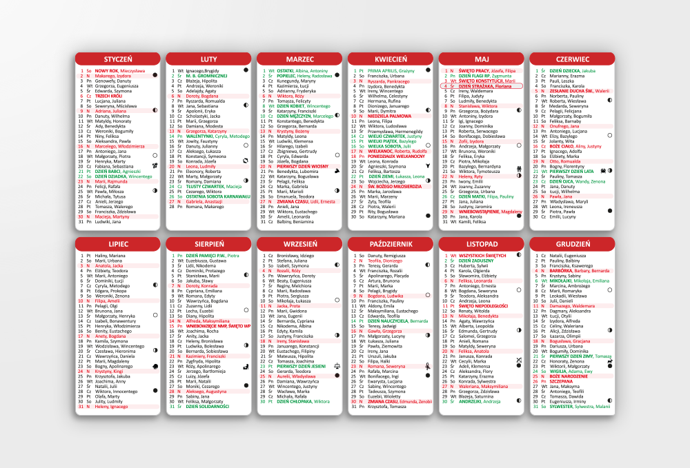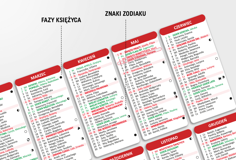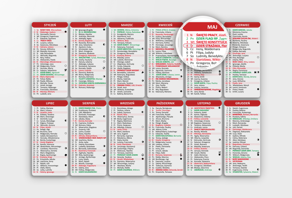 - Dodatki: oznaczony dzień strażaka, fazy księżyca, znaki zodiaków, niedziele handlowe
