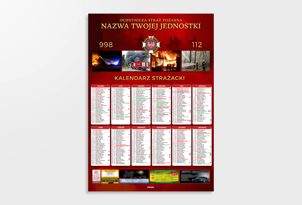 Planujecie wykonać projekt kalendarzy strażackich we własnym zakresie? Nie traćcie czasu na przygotowanie kalendarium, tylko skorzystajcie z gotowca, którego według własnego uznania dostosujecie do własnych potrzeb. Po zakupie kalendarium wysyłamy zestaw plików roboczych, dzięki czemu kalendarium dostosujecie do swojej kolorystki i umieścicie ważne dla Was daty.